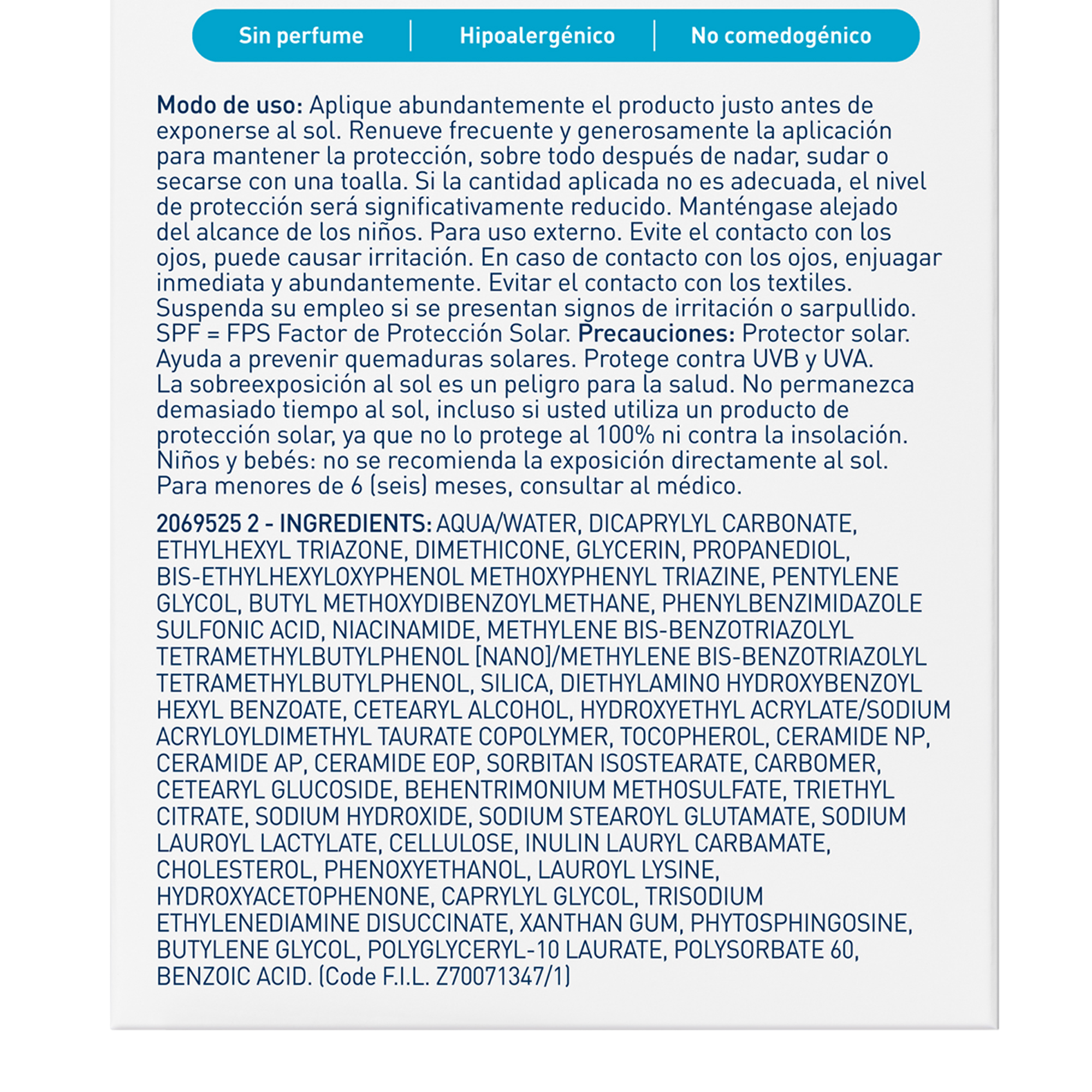 Composition : AQUA / WATER • DICAPRYLYL CARBONATE • ETHYLHEXYL TRIAZONE • DIMETHICONE • GLYCERIN • PROPANEDIOL • BIS-ETHYLHEXYLOXYPHENOL METHOXYPHENYL TRIAZINE • PENTYLENE GLYCOL • BUTYL METHOXYDIBENZOYLMETHANE • PHENYLBENZIMIDAZOLE SULFONIC ACID • NIACINAMIDE • METHYLENE BIS-BENZOTRIAZOLYL TETRAMETHYLBUTYLPHENOL [NANO] / METHYLENE BIS-BENZOTRIAZOLYL TETRAMETHYLBUTYLPHENOL • SILICA • DIETHYLAMINO HYDROXYBENZOYL HEXYL BENZOATE • CETEARYL ALCOHOL • HYDROXYETHYL ACRYLATE/SODIUM ACRYLOYLDIMETHYL TAURATE COPOLYMER • TOCOPHEROL • CERAMIDE NP • CERAMIDE AP • CERAMIDE EOP • SORBITAN ISOSTEARATE • CARBOMER • CETEARYL GLUCOSIDE • BEHENTRIMONIUM METHOSULFATE • TRIETHYL CITRATE • SODIUM HYDROXIDE • SODIUM STEAROYL GLUTAMATE • SODIUM LAUROYL LACTYLATE • CELLULOSE • INULIN LAURYL CARBAMATE • CHOLESTEROL • PHENOXYETHANOL • LAUROYL LYSINE • HYDROXYACETOPHENONE • CAPRYLYL GLYCOL • TRISODIUM ETHYLENEDIAMINE DISUCCINATE • XANTHAN GUM • PHYTOSPHINGOSINE • BUTYLENE GLYCOL • POLYGLYCERYL-10 LAURATE • POLYSORBATE 60 • BENZOIC ACID (F.I.L. Z70071347/1).